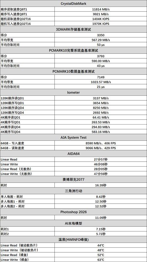最值得關注的是其溫度表現。即便在無散熱片裸盤環境下,也未見明顯高溫,性能發揮基本不受影響,此類“冷靜”的表現在目前的PCIe 5.0產品中較爲少見。加上低於6W的滿載功耗,使其對筆記本用戶和緊湊型主機格外友好。