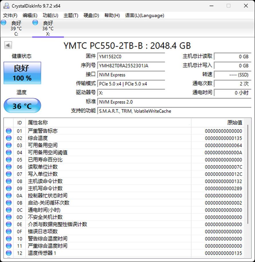 先使用CrystalDiskInfo軟件看一下該盤的信息,可以看到這是一塊讀寫均爲0GB的新盤,可以最大程度地保證性能完全發揮。在使用主板自帶被動散熱片的情況下,待機溫度僅爲36℃。
