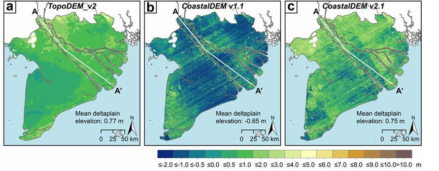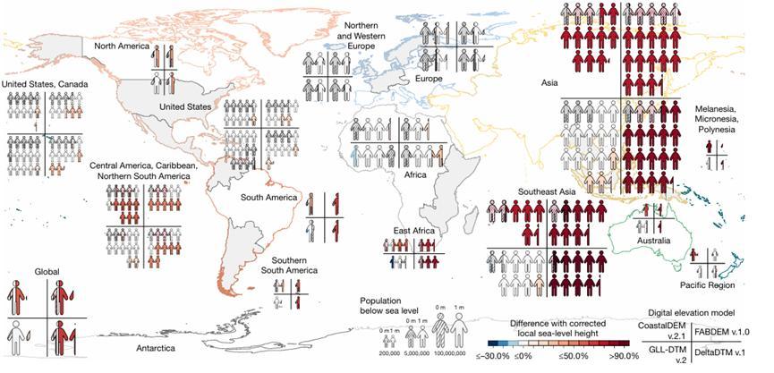 研究團隊選取當前性能最優的四個全球數字高程模型,在設定"1 米相對海平面上升"情景下,對比糾正基準面錯誤前後的淹沒結果,並交叉使用多源高精度人口數據集確保估算準確。