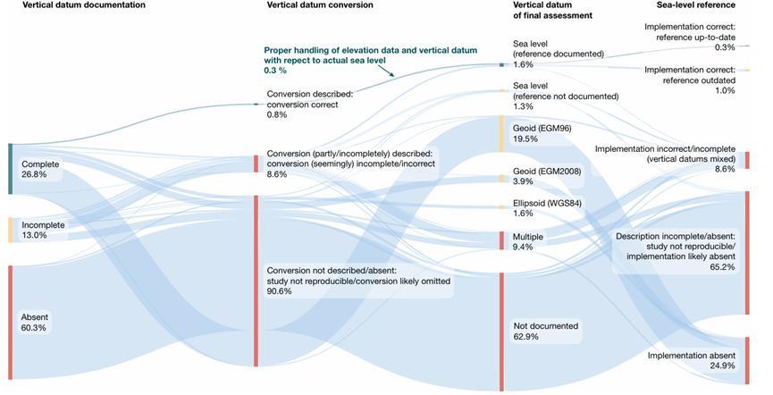 結果令人大跌眼鏡:超過 99%的災害評估研究在處理海平面與陸地高程數據時存在方法論缺失。其中,高達 90%的研究直接將大地水準面"零點"等同於局部平均海平面;73%的研究對垂直基準面的技術記錄殘缺或完全缺失。在浩如煙海的文獻中,僅有 0.3%——也就是隻有一篇,做到了完整記錄數據源、正確執行基準面轉換,並使用包含動態地形的最新海平面觀測數據。