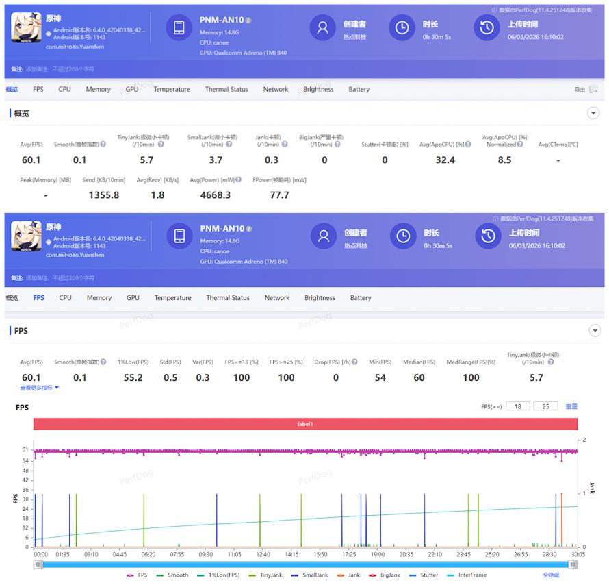 實測《原神》開啓高畫質60fps模式,平均幀率可以達到60.1fps。穩幀指數依然只有 0.1,功耗則是來到4.668W。