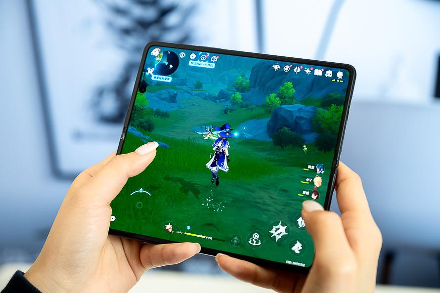 玩《原神》這類開放世界遊戲,摺疊屏的大內屏在視覺上的感受相較於直板機感受會好上不少,而且手機展開後散熱效果也會更好,並且手掌握持是在外屏這一側,而手機發熱主要集中於相機一側,所以手掌握持實際體驗也會好很多。