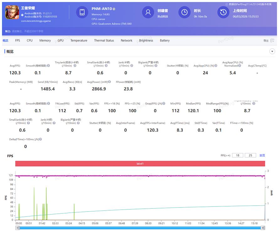 在遊戲體驗方面,我們測試《王者榮耀》,設置極高幀率、超高分辨率、極致畫面總質量,實測遊戲平均幀率可以達到120.3fps,穩幀指數僅有0.1,平均功耗2.876W,可謂是幀率又穩,功耗又低。