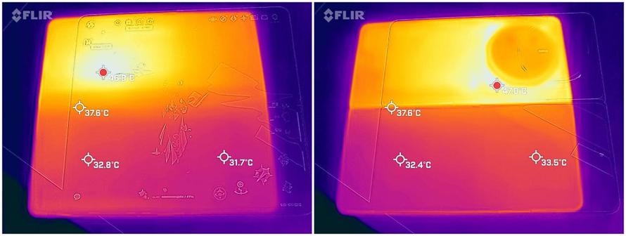 通過紅外測溫儀,可以看到溫度主要集中在屏幕上半區域,最高溫度來到了47℃左右,而手掌區域的溫度則是隻有33℃左右,非常地清涼。