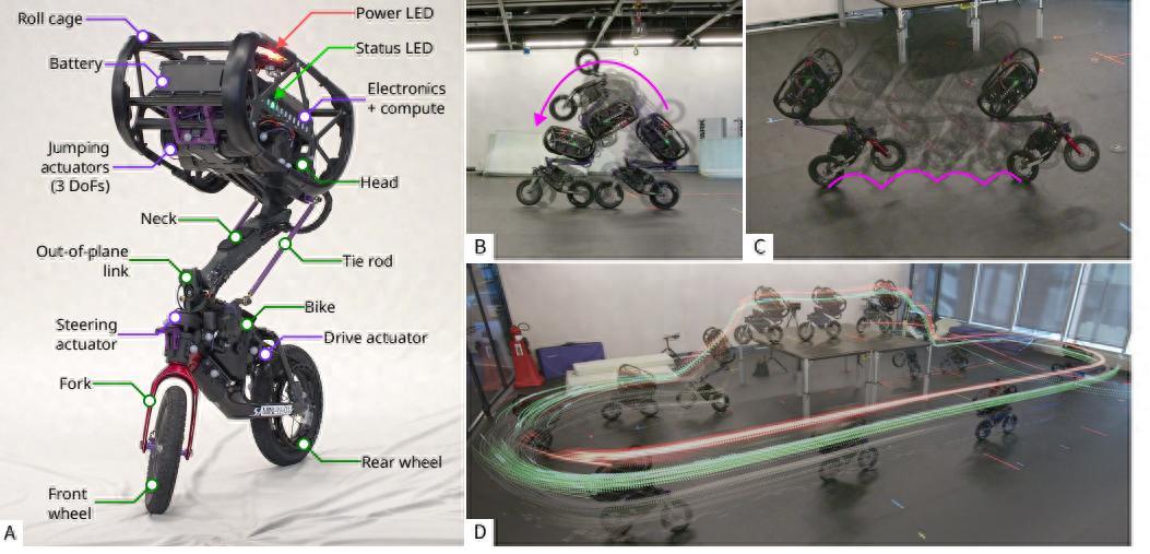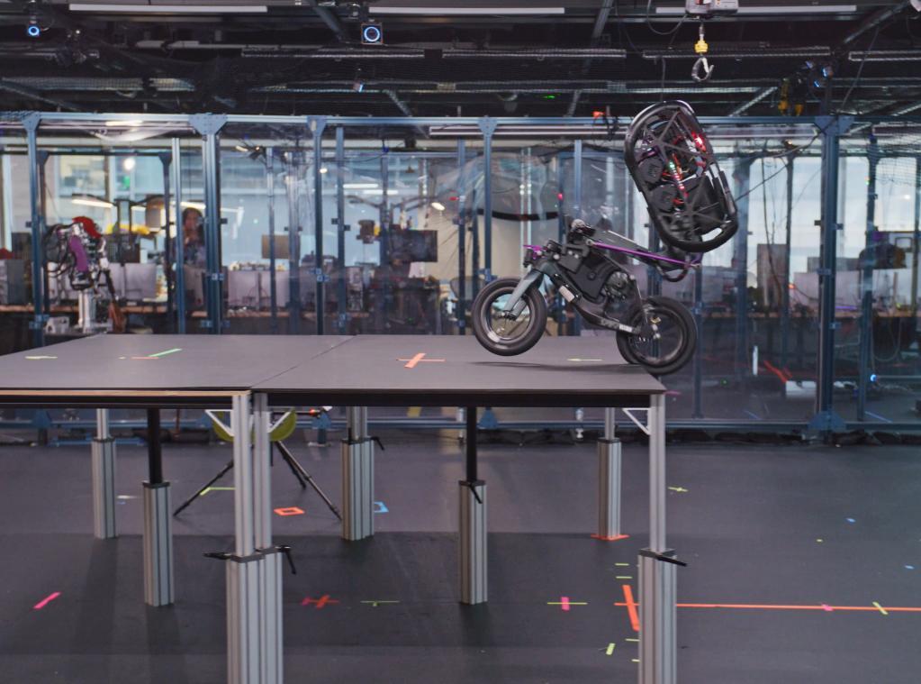 這臺重 23.5 公斤的機器人只有一個自行車的基本骨架,外加一個會動的腦袋。當它在平地上奔跑時,最高速度能夠達到每秒 8 米,比人類百米衝刺還快。遇到臺階或者障礙物的時候,它不需要繞路,直接原地起跳就能翻過去。更厲害的是,它只用後輪就能站立,能像雜技演員一樣原地轉圈,也能連續跳躍着前進。