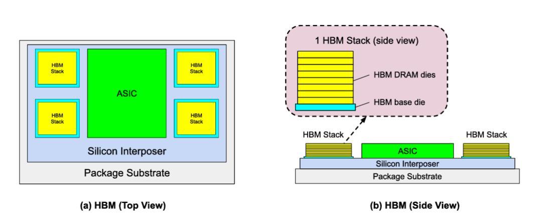 圖 | (a) 高帶寬內存 HBM 封裝俯視圖,(b) HBM 側視圖(來源:論文)