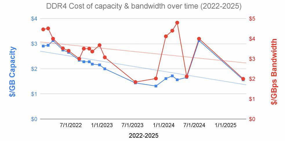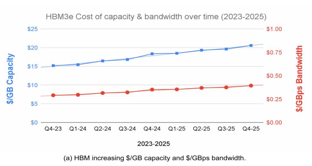 更麻煩的是,HBM 的成本不降反升。論文援引花旗銀行的研究數據指出,從 2023 年到 2025 年,HBM 的單位容量成本(/GB)和單位帶寬成本(/GB)和單位帶寬成本(/GB)和單位帶寬成本(/GBps)都上漲了約 35%。這與傳統 DDR DRAM 形成了鮮明對比,後者的成本在同期下降了近一半。