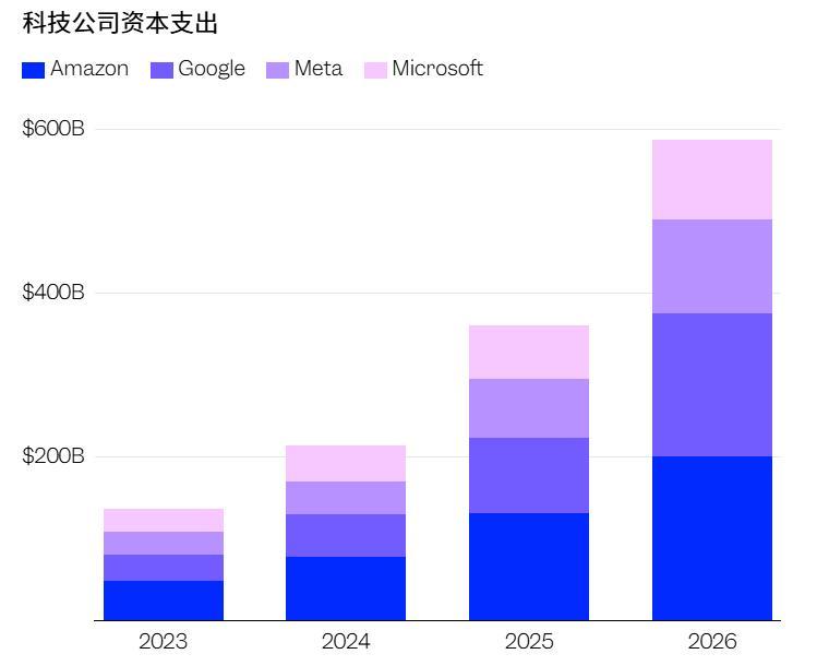 根據多家媒體報道,微軟、亞馬遜、谷歌、Meta 四大科技巨頭在 2026 年 AI 相關資本總開支預計達到約 6,000 億美元。這一規模相比 2025 年約 3,880 億美元,增長約 50% 以上。
