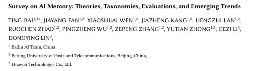 近期,北京郵電大學百家 AI MemoryOS 團隊與華爲聯合在 GitHub 發表了一篇綜述論文《AI 記憶綜述:理論、分類、評測與趨勢》(Survey on AI Memory:Theories, Taxonomies, Evaluations, and Emerging Trends)[1]。