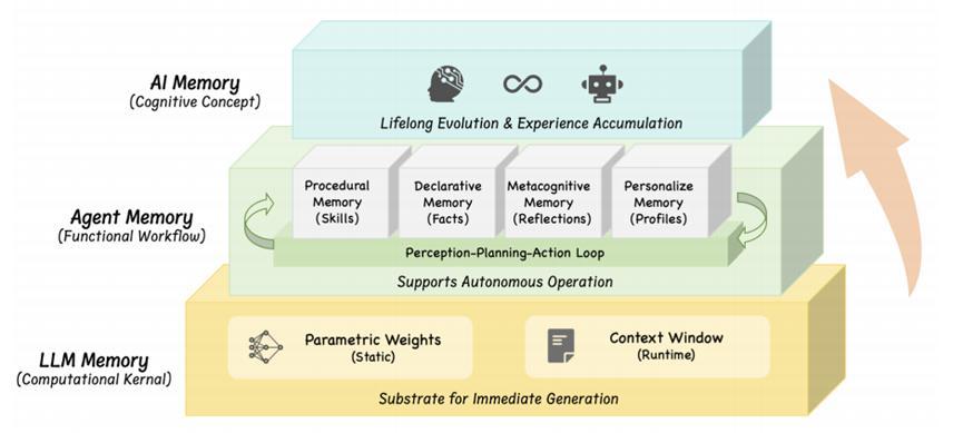 ·AI Memory:是一種更宏觀的認知概念,旨在實現終身進化、長期持久性和適應性,它是面向終身學習、自進化的更高抽象。