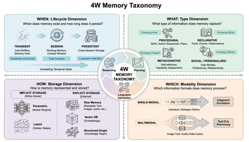 研究團隊結合認知心理學、神經科學及記憶系統的經典理論,提出了一套清晰的 AI 記憶分類方法(4W 分類體系),並系統梳理了當前 AI 記憶的技術架構、應用場景和評估基準。