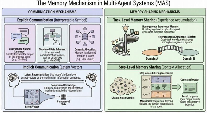 從通信機制分類來看,顯式通信通常包括非結構化自然語言交互、結構化數據範式(如 JSON、UML),以及動態路由;而隱式通信則通過壓縮向量、嵌入或知識壓縮實現。釐清通信方式之後,才能進一步理解多智能體中的記憶共享。
