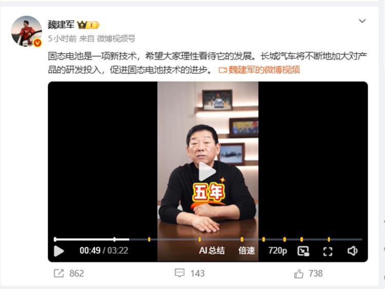 而在這個全球都在講固態電池故事的時候,一向“說實話”的長城汽車董事長魏建軍,又出來“潑冷水”了。近日其發佈視頻,披露了長城汽車在全固態電池領域的研發進展。