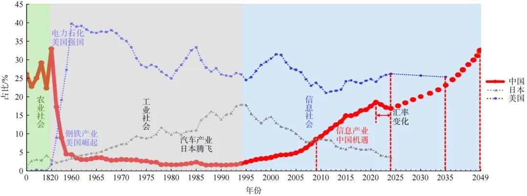 中國、美國、日本歷年 GDP 佔世界 GDP 的比例