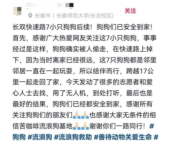 後來志願者證實,七隻狗來自同一個村,分屬三家主人,平時就一起玩。有主人說,自家丟的是德牧和金毛,萬幸能回來,沒被別人喫了狗肉。