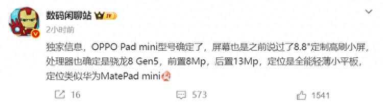3月20日消息,博主@數碼閒聊站 今天爆料稱,OPPO將會推出一款小尺寸平板OPPO Pad mini,定位全能輕薄小平板。