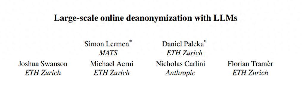 來自瑞士蘇黎世聯邦理工學院、Anthropic 等機構的研究人員在一項研究中得出了驚人結論:他們在 Hacker News、Reddit 等平臺開展測試後發現,大模型通過匿名賬號的零散帖子,在特定數據集與實驗中能以 90% 的精確率(precision)識別出這些匿名的網絡賬號對應的真實用戶 [1]。