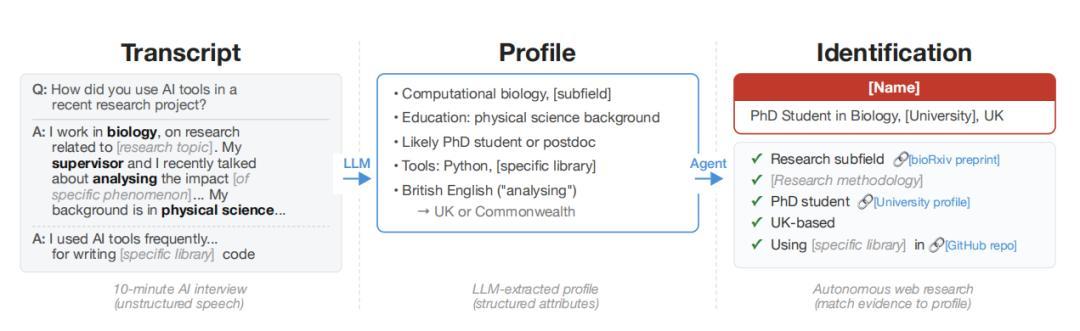 “我們發現,這些 AI 智能體可以做到以前非常難實現的事情:從自由文本(例如匿名訪談記錄)出發,它們可以逐步還原出一個人的完整身份。”該論文作者之一 Simon Lermen 在接受媒體採訪時表示,“這是一項全新的能力,以前的身份重識別方法通常需要結構化數據,以及兩個具有相似模式且可以鏈接在一起的數據集。”