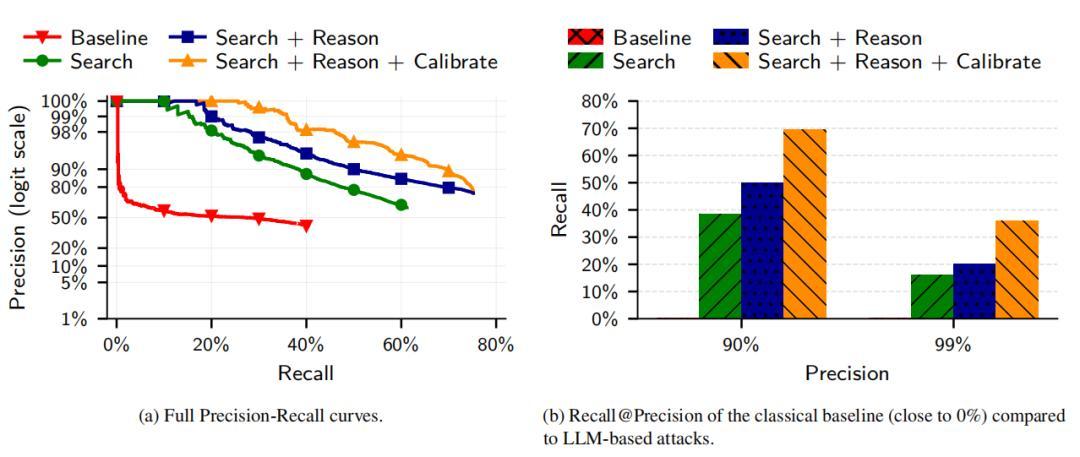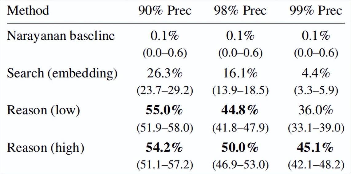 這個研究就是針對 AI 偵探的性能進行的實驗。研究人員開發了四步攻擊流程:特徵身份提取、語義匹配搜索、推理篩選最優候選結果、置信度評分校準。結果表明,在 90% 精確率條件下召回率(recall,指被正確識別出的目標用戶佔比)達 68%。與之對比的是,傳統方法的召回率接近於 0%。