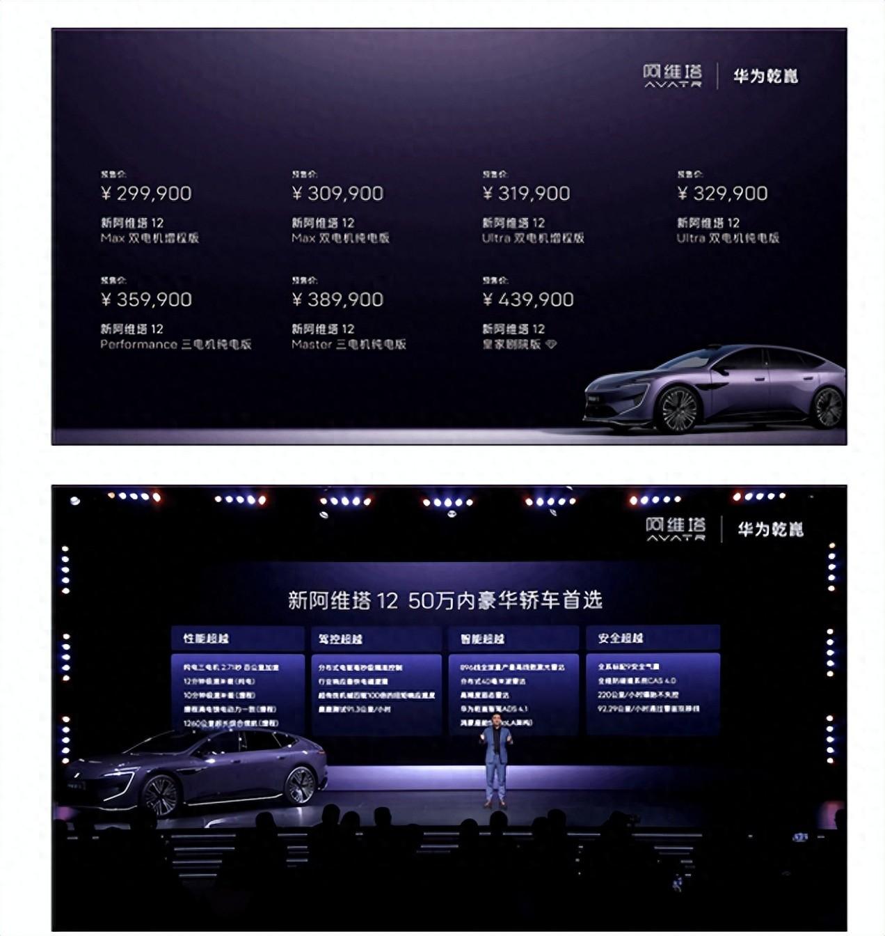 七款車型,29.99萬到43.99萬,橫跨14萬的價格區間,配置層面,全系滿血華爲乾崑ADS性能是阿維塔12最大的誠意。光看數量就讓人頭大。但仔細拆開看,其實就三個層次:最基礎的Max版,中間的Ultra版,以及上面幾個純電專屬的高性能版和頂配皇家劇院版。