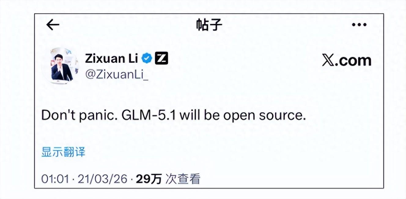 3月21號,智譜的全球負責人李子玄在海外社交平臺上發了一條推文,只有一句話:“Don''t panic. GLM-5.1 will be open source.”別慌,GLM-5.1會開源。