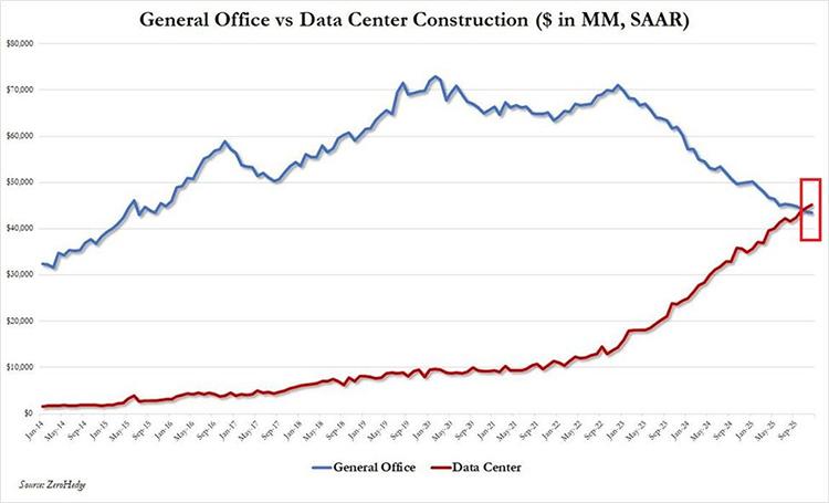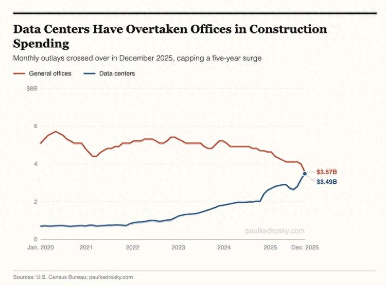 據全球資本市場評論刊物Kobeissi Letter報道,去年12月美國數據中心單月建設支出達到了35.7億美元,而傳統辦公樓項目支出爲34.9億美元,這是數據中心建設支出首次超越傳統辦公樓項目,預示着AI基建設施浪潮正在走向高峯。