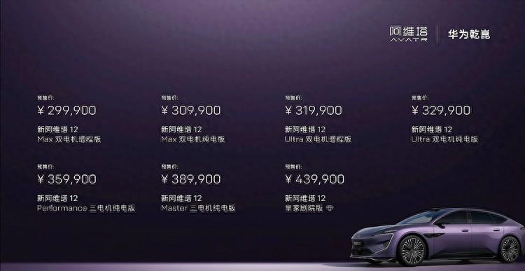 目前,新款阿維塔12一共有7個配置版本,預售價覆蓋29.99萬-43.99萬元,涉及純電與增程兩種動力。這個定價策略很有意思:入門版直接殺進30萬以內,頂配則逼近44萬,覆蓋了從主流到準豪華的完整區間。