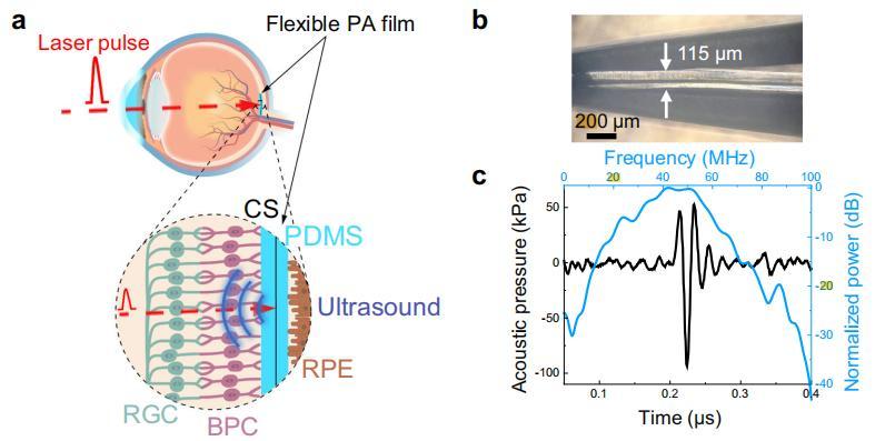 根據實驗數據,這種薄膜的光聲轉換效率能實現每微焦耳激光能量產生 26 千帕的聲壓。經測試,在距離薄膜表面 0.9 毫米處的峯值聲壓爲 146.2 千帕,這一強度“剛剛好”:既能激活視網膜神經迴路,又顯著低於傳統超聲換能器刺激視網膜所需的聲壓。