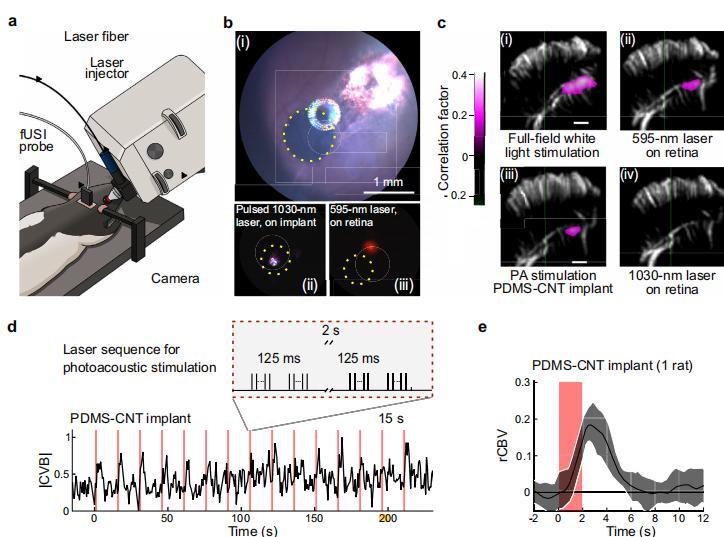 光聲轉化的本質是能量轉化的物理過程:1,030 納米波長的近紅外激光經蠟燭菸灰的光吸收層轉換成熱能,然後再通過聚二甲基硅氧烷的熱膨脹和收縮性能轉化爲頻率約 42 兆赫茲的超聲波脈衝,進而精準刺激尚能工作的視網膜細胞,最終在動物實驗中實現了視覺信號向大腦的傳遞。