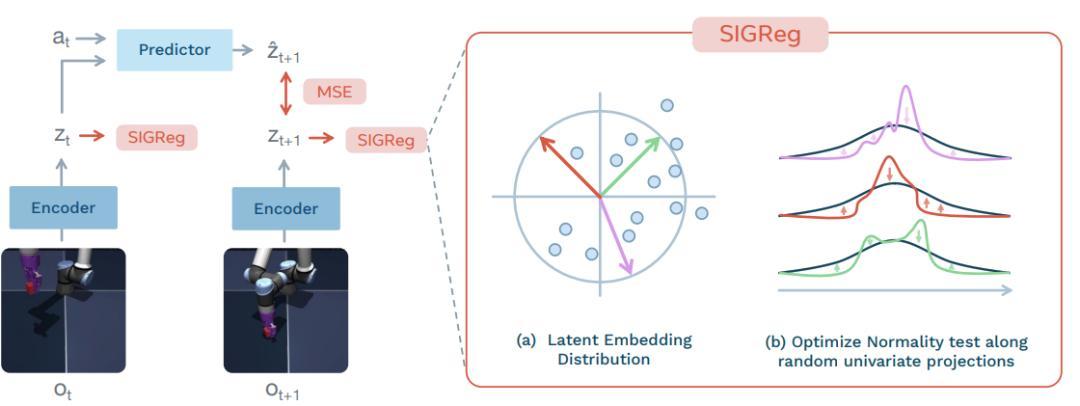 LeWM 最核心的突破,在於用兩個簡單且有科學支撐的訓練目標,從根本上解決了傳統 JEPA 的“表示崩潰”問題,徹底摒棄了經驗性技巧。其一爲預測損失,是讓 AI 精準預測未來的核心特徵,保證學的規律有用;其二是 SIGReg 正則化,逼着 AI 把核心特徵分佈得均勻多樣,不讓它把所有畫面都映射成一樣的特徵。