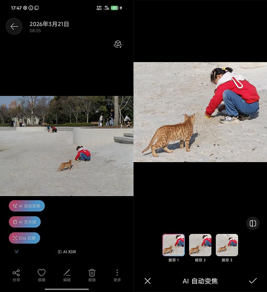 另外一個很有意思的功能,是AI Auto Zoom,也就是自動變焦。簡單來說,藉助這個功能,你不需要提前花太多心思去考慮構圖,可以先把整個場景拍下來。之後系統會自動識別人、貓、狗、鳥等主體,並對畫面進行自動裁切,目標是生成更清晰、構圖也更合理的結果。