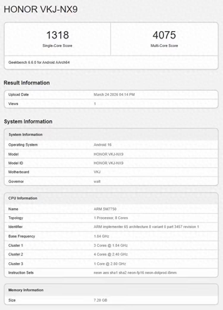 3月25日消息,日前,一款疑似榮耀600標準版的設備現身Geekbench跑分庫,根據曝光信息,這款新機對應型號爲VKJ-NX9,頁面顯示其搭載代號爲SM7750的芯片、配備8GB內存,並運行Android 16系統。結合目前外媒和行業信息來看,SM7750基本可以對應高通驍龍 7 Gen 4,這也意味着榮耀600有望成爲一款主打中端性能與均衡體驗的新機。