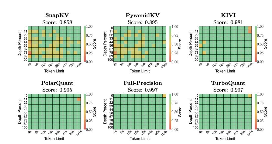 實驗結果的亮點集中在幾個方面。在“大海撈針”(Needle-in-a-Haystack)測試中,TurboQuant 在將 KV 緩存壓縮至少 6 倍的情況下,取得了與未壓縮基線完全一致的 0.997 分,而此前廣泛使用的 KIVI 方法在同等壓縮條件下得分爲 0.981,SnapKV 和 PyramidKV 等 token 級剪枝方案的表現則更弱。