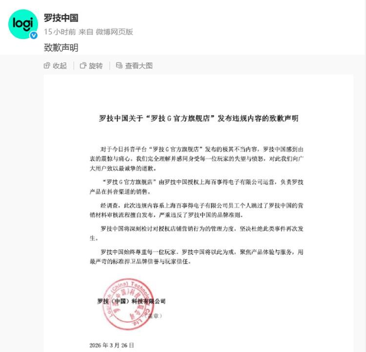 只見道歉聲明裏寫着“完全理解每一位玩家的失望與憤怒,致以最誠摯的道歉,違規內容繫上海百事得電子有限公司員工個人跳過了羅技中國的營銷材料審覈流程擅自發布”。