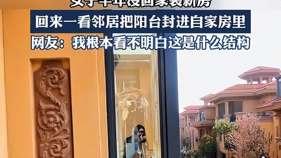 26號,網上爆出一件事,江蘇有一女子,半年沒回自己家。等她回去推開臥室窗戶,發現窗戶外頭直接就是鄰居家的陽臺。那陽臺封得嚴嚴實實,緊貼着她家窗戶,等於鄰居把陽臺擴建到了她房子的範圍內。