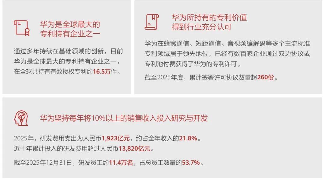 誰都知道,美國製裁的核心,就是想卡華爲的“脖子”,讓我們沒有核心技術可用。但華爲早就看透了這一點,這十年累計13820億元的研發投入,不是盲目砸錢,而是精準佈局,一點點構建自己的技術壁壘。截至2025年底,華爲研發員工就有11.4萬名,佔總員工的53.7%,全球持有有效授權專利約16.5萬件,每一件專利,都是打破制裁的底氣。
