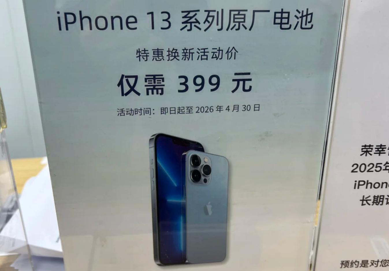 2026年1月初,蘋果官方宣佈面向iPhone13全系機型開啓限時電池換新活動,原本729元的換電服務在優惠期內只需支付399元即可更換新電池,截止日期爲4月30日。