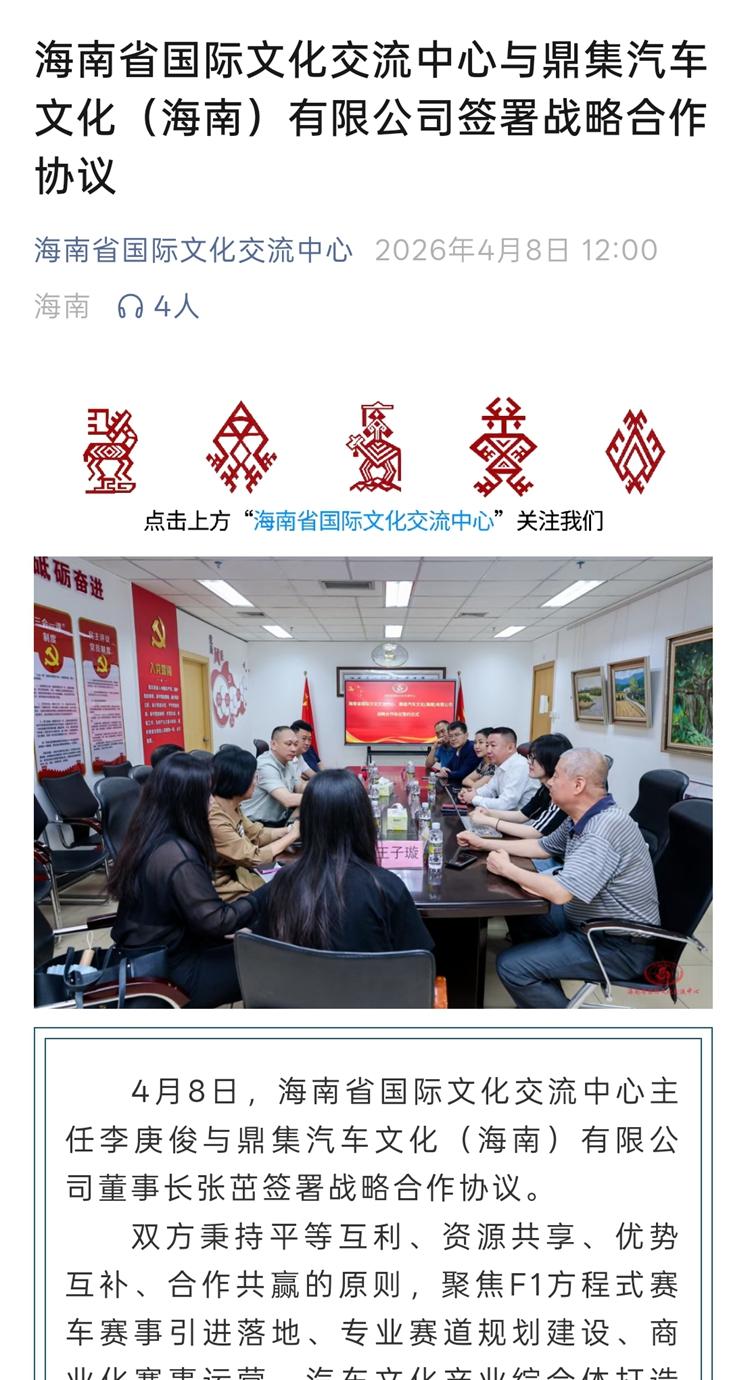 近日,海南省國際文化交流中心發佈消息,其與鼎集汽車文化(海南)有限公司簽署戰略合作協議,雙方將在F1賽事引進等方面開展全方位務實合作。