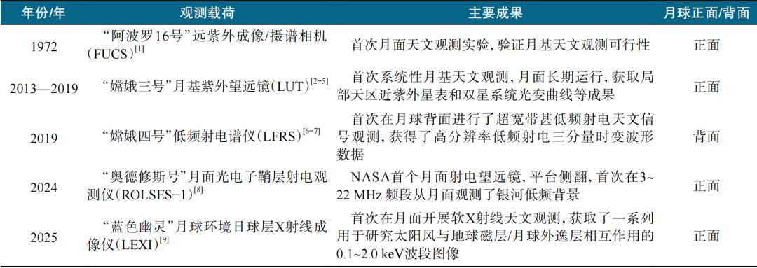 目前已成功着陸月表並開展月基天文觀測的任務主要包括:1972年美國“阿波羅16號”(Apollo 16)任務首次實現人工短暫月基遠紫外天文觀測;2013—2019年中國“嫦娥三號”任務首次實現無人長期近紫外月基天文巡天觀測;2019年中國“嫦娥四號”任務首次在月球背面進行了超寬帶甚低頻射電天文信號觀測;2024年美國的“奧德修斯號” (Odysseus /IM−1)開展了低頻射電頻段天文觀測,並首次在3~22 MHz頻段從月表觀測了銀河低頻背景;2025年美國的“藍色幽靈”(Blue Ghost 1)任務開展了軟X射線天文觀測。