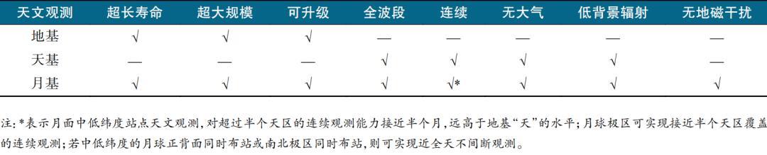 地基、天基和月基的天文觀測特點比較情況見表1。