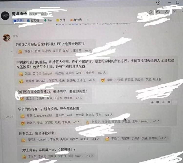 俞浩在羣裏對員工表示:宇樹來搶我們的熊貓,和搶籤大佬甜,你們不僅是守,還要去搶宇樹的所有東西,宇樹直播間去過的人,全部搶過來籤獨家,包括每個主播,還有宇樹的其他東西。宇樹的所有客戶,所有投標,所有員工,要全部搶過來。