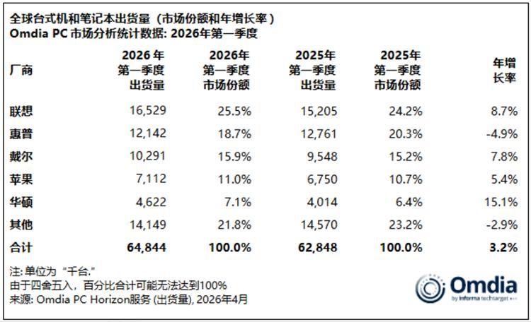 存儲漲價,導致PC價格上漲,按照常理來說,PC的出貨量應該有所下滑纔對。但是來自Omdia的最新研究數據,2026年第一季度的全球PC出貨量反而同比增長了3.2%。