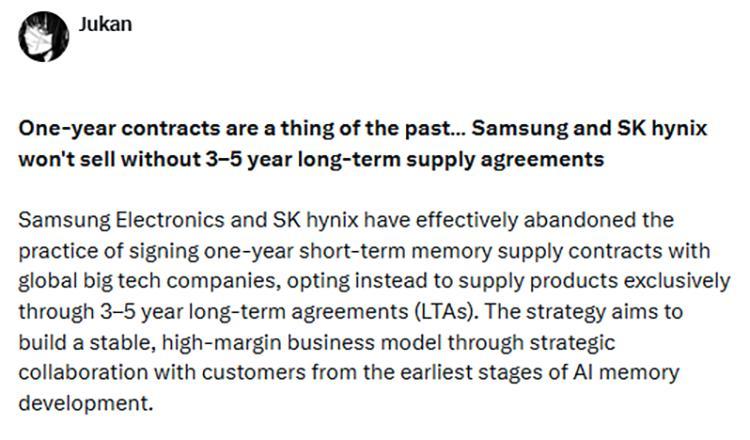 那在這種情況下,我們也有理由相信三星與SK海力士是爲了規避以後出現價格大跳水的風險,從而提前制定多年的長期供應既定合約價格,以換取未來數年內的營收穩定性與利潤可預見性,從而對沖未來在供需上的潛在風險。