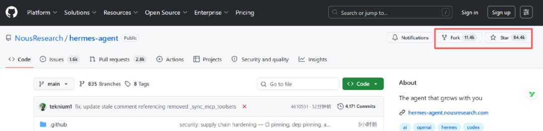 Hermes,由於發音原因也被人們稱之爲“愛馬仕”,它是由美國 Nous Research 在 2026 年 2 月開源的 Hermes Agent。這個在美國紐約誕生、由 Jeffrey Quesnelle、Karan Malhotra 與 Teknium 等極客研發的 Agent,正在以一種掀桌子的姿態屠榜 OpenRouter 算力榜。截至目前,Hermes 的 GitHub stars 數達到 84.4k。