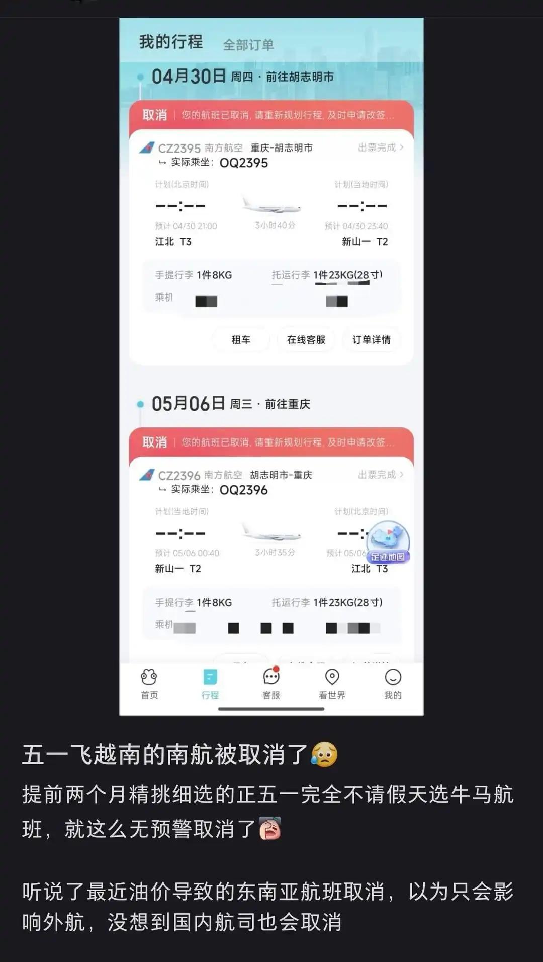 這事對旅客的衝擊是實打實的。有不少網友吐槽說,"提前兩個月精挑細選,五一完全不請假的航班,就這麼毫無預警地取消了""雖然可以無損退票,但同時期的直飛已經飆到5000塊了"還有人更慘:"5月1日到5日的機票全被取消了,酒店早都訂好了,不能退,怎麼辦?"