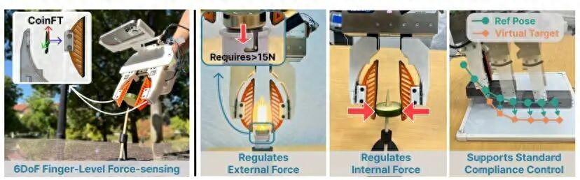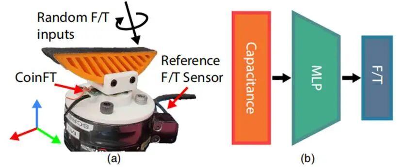 這個系統的核心是一個叫做 CoinFT 的微型傳感器,直徑 20 毫米,厚度只有 3 毫米。其內部結構由幾層帶橢圓支柱的介電材料組成,受到壓力時電容會發生變化。還有一個五層的神經網絡把這些電容值換算成爲力和力矩,校準後的精度非常高,力的誤差在 0.15 到 0.58 牛之間,力矩誤差在 17 到 231 毫牛米之間。相比之下,傳統工業使用的六軸力覺傳感器又大又貴,一個就要幾萬塊錢,而且特別嬌氣一不小心就會被摔壞。而 CoinFT 成本只有 10 美元,既耐摔又耐撞。