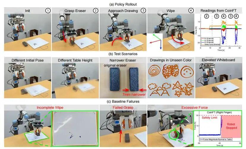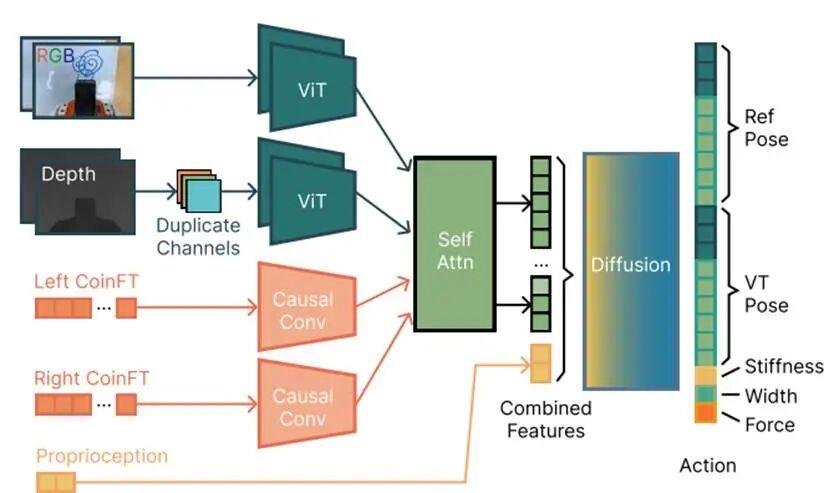 而前面提到的 UMI-FT 系統不僅是增加了傳感器,還把蘋果手機綁在了機器人的手上。手機負責提供 RGB 攝像頭、超廣角攝像頭、深度攝像頭和姿態數據,刷新率從 10 到 60 赫茲不等。指尖的力覺傳感器以 360 赫茲的速度進行超快採樣,所有數據都會被記錄下來。訓練時,研究團隊採集了 200 到 630 組不等的人類演示數據,每組數據都包含了圖像、深度、姿態和每個手指的六維力覺信息。然後,他們使用這些數據訓練了一個自適應柔順策略模型(ACP)。這個模型會輸出機器人的目標位置、虛擬目標位置、剛度矩陣、抓握力和夾爪寬度。底層有兩個控制器在同時工作,腕部柔順控制器根據兩個手指傳來的力和力矩,調整機器人手臂的位置和姿態,抓握力控制器則負責調節手指夾緊的力度。