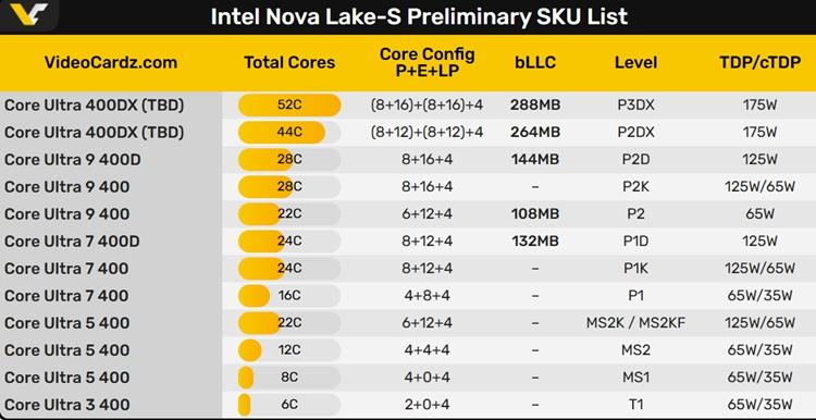 根據最新的曝光,英特爾共有五款處理器將會搭載bLLC緩存,其中包括酷睿Ultra 400DX兩款處理器,應該是面向發燒級市場,包括52核以及44核版本,同時這兩款處理器預計將會採用雙芯設計,因此bLLC緩存大小相當強悍,分別爲288MB以及244MB,當然它們的TDP也到達了175W,估計滿載功耗會超過300W。