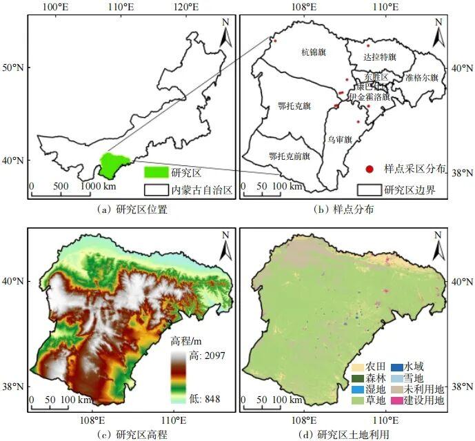 鄂爾多斯(37°35′N~40°51′N,106°42′E~111°27′E)位於內蒙古自治區西南部,地處中國北方農牧交錯帶與乾旱半乾旱氣候過渡區,是黃河流域生態保護和高質量發展的關鍵區域,也是構築北方生態安全屏障的重要組成區域。遵循地貌類型與植被羣落相結合的採樣原則,在烏審旗、鄂托克旗等5個旗縣內選取9個典型樣區(圖1)。樣區涵蓋了流動沙地、半固定沙丘、丘陵及硬梁地等主要生境類型,確保了樣本在物種組成、覆蓋度及立地條件等方面的多樣性與代表性。