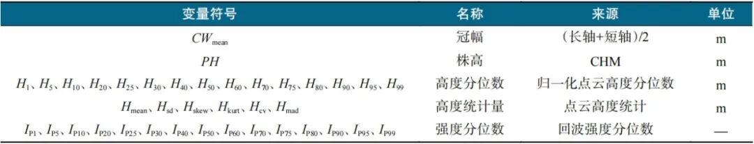 對歸一化後的點雲數據進行對象尺度的特徵統計,提取能夠反映灌木垂直結構與體積特徵的關鍵變量(表3)。